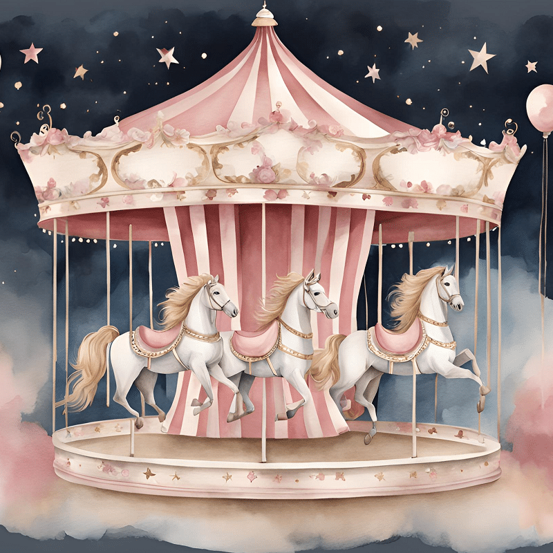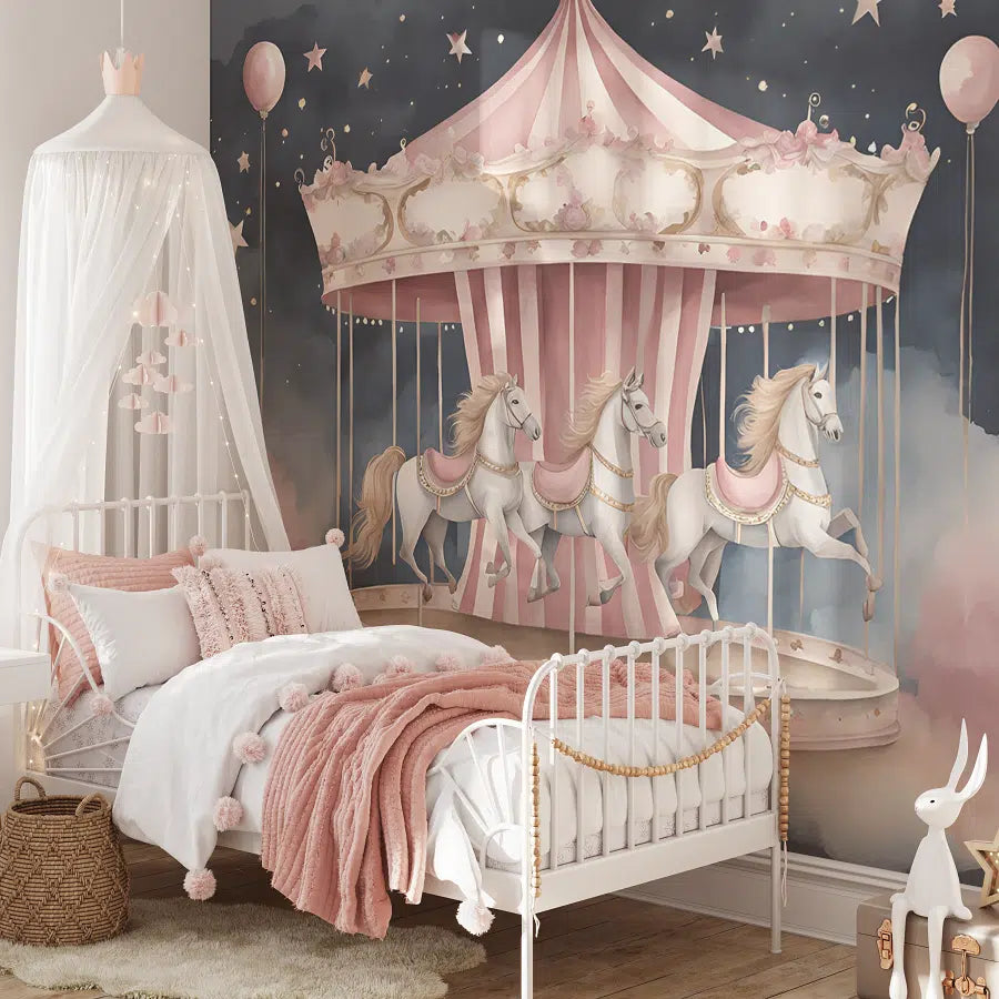 Prachtig behang met paarden en carrousel print. Gedrukt op hoogwaardig fleece, zorgt het voor duurzaamheid en weerstand tegen beschadiging.