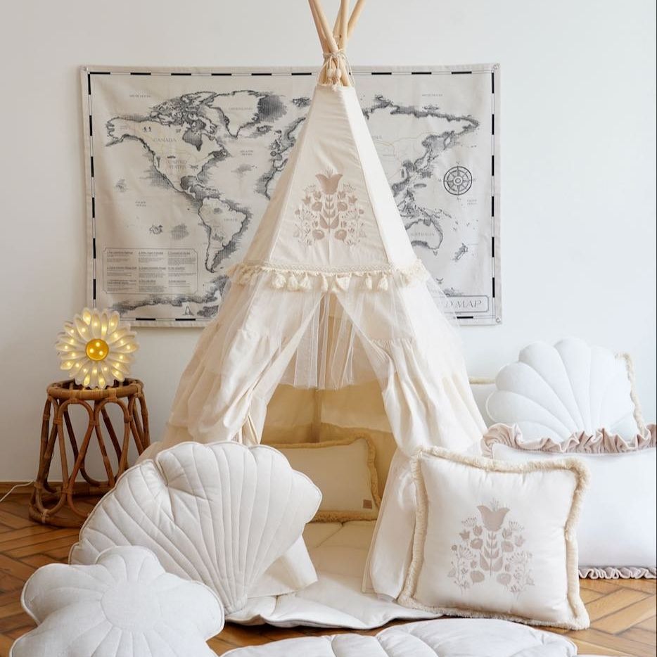 Deze tipi is gemaakt van natuurlijke materialen: 100% katoen en dennenstokken. Dankzij de constructie met vijf muren is de tent stabiel wanneer deze wordt uitgevouwen, de stokjes gerafeld, in tunnels geplaatst die aan de onderkant zijn genaaid. Deze tipi zal is ideaal om te gebruiken thuis, in de tuin of op het strand!