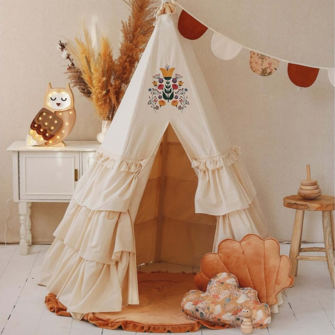 Deze tipi is gemaakt van natuurlijke materialen: 100% katoen en dennenstokken. Dankzij de constructie met vijf muren is de tent stabiel wanneer deze wordt uitgevouwen, de stokjes gerafeld, in tunnels geplaatst die aan de onderkant zijn genaaid. Deze tipi zal is ideaal om te gebruiken thuis, in de tuin of op het strand!