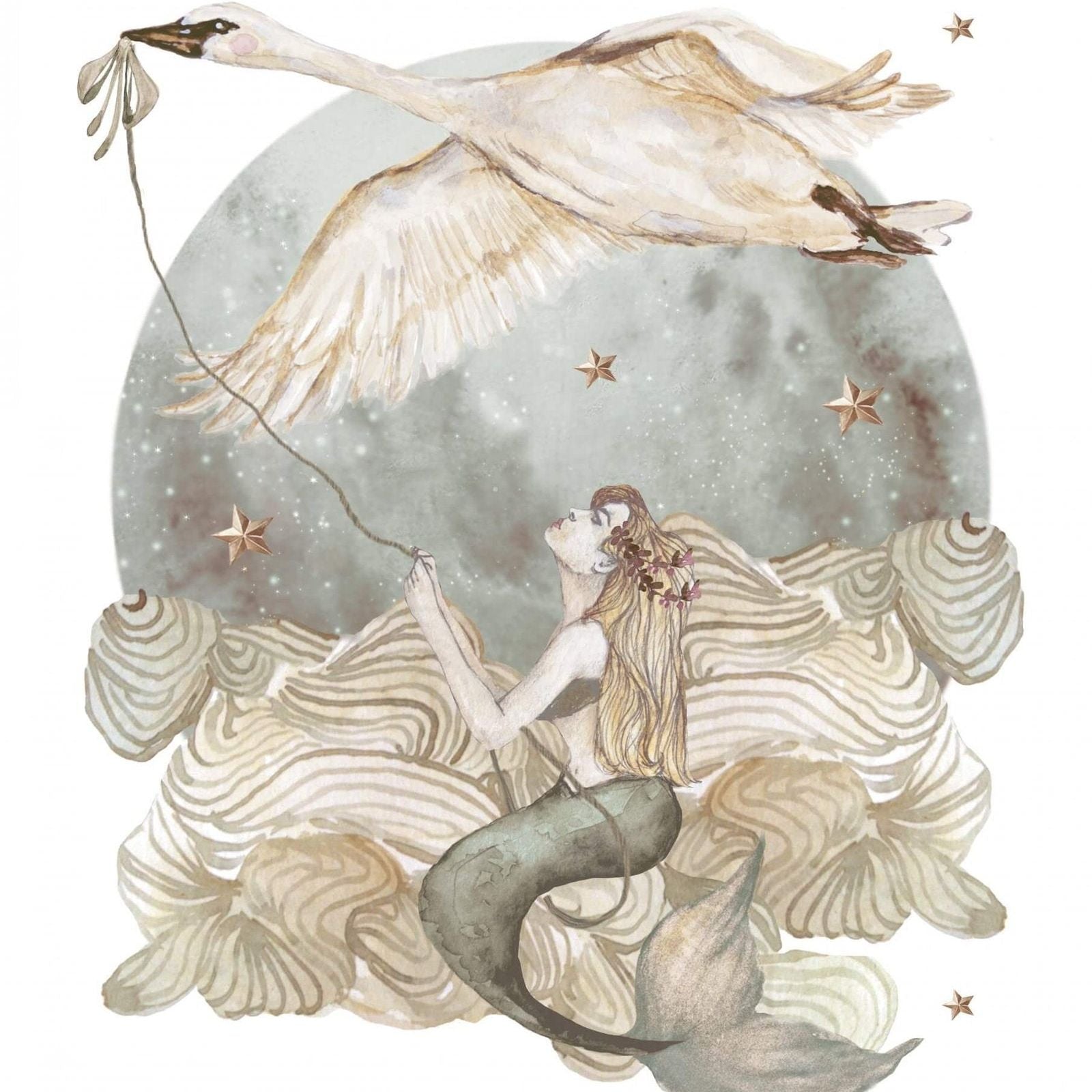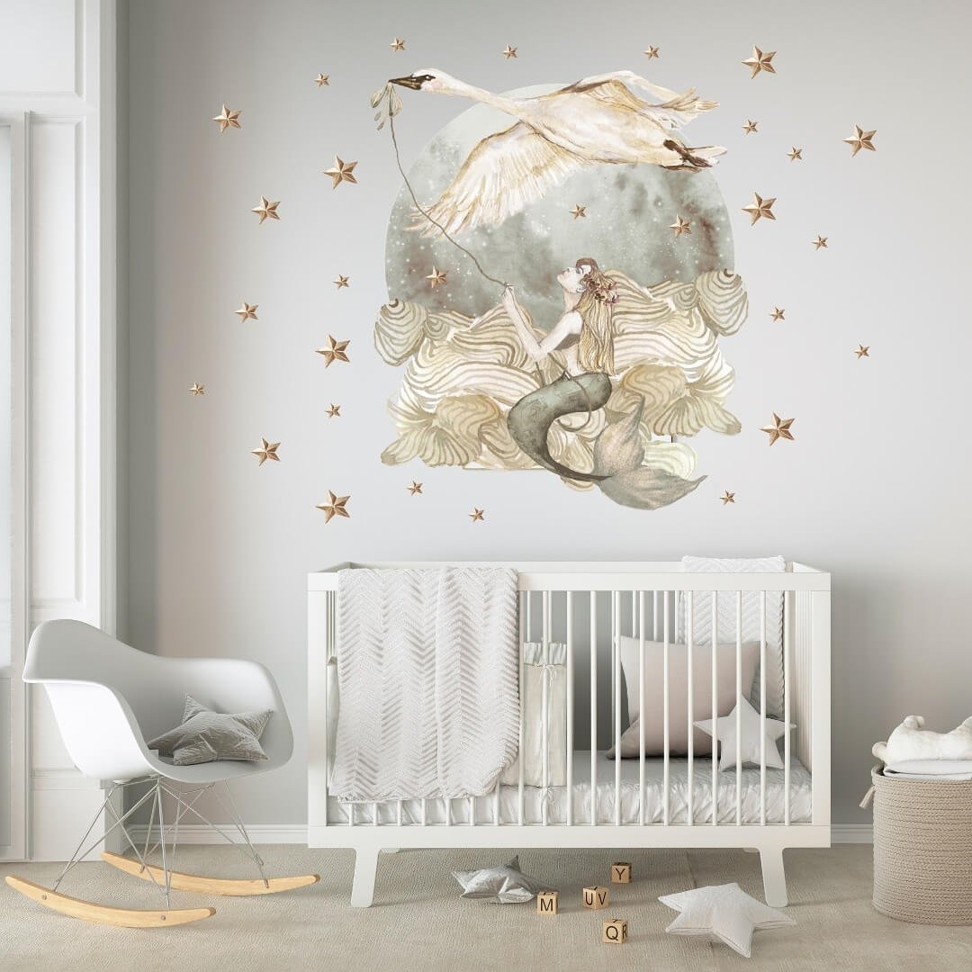 Prachtige wandsticker met een mooie zeemeermin en een zwaan. Dit is een perfecte decoratie van de kamer kind. Met deze sticker creëer je een magische uitstraling in de kinder/baby kamer.