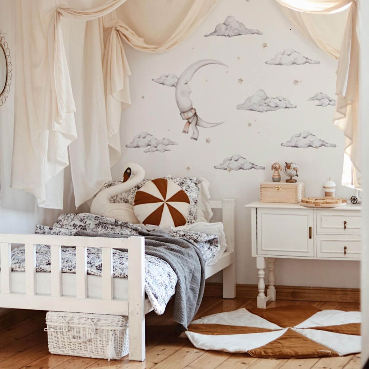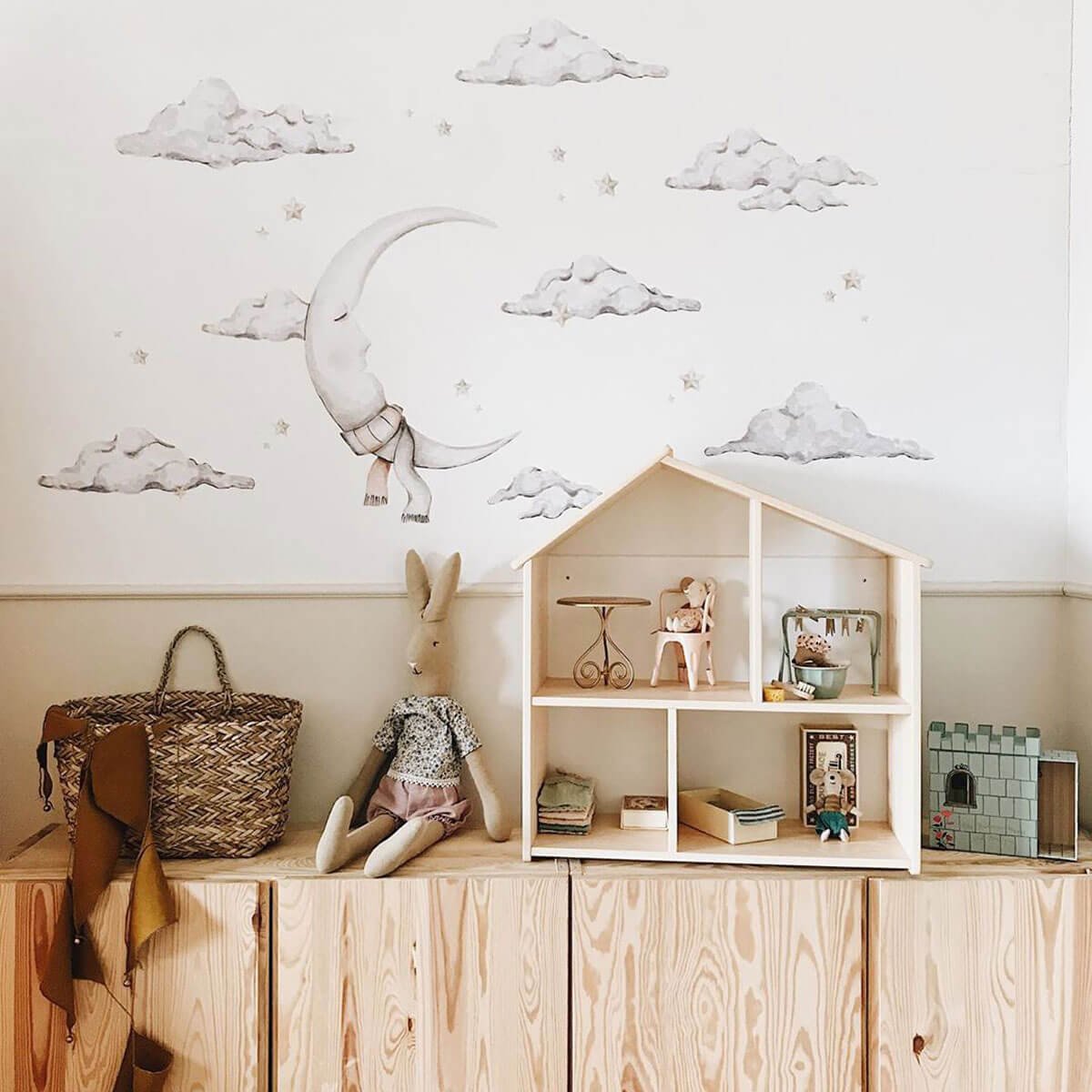 Een prachtige set met een maan, 7 wolken en 20 sterren, genoeg om van een kamer een magisch land te maken. De elementen die Kasia Bachor met aquarellen schilderde zijn delicaat, maar niet bleek, dus ondanks de besparingen in kleuren ziet deze sticker er ook prachtig uit op een witte muur, wat een ideale sfeer creëert om sprookjes te vertellen en… in slaap te vallen.
