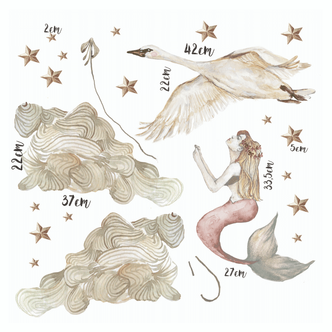 - Afmeting:De sticker bevind zich op een vel van 70 x 70 cm bestaat uit 6 grotere elementen en 18 sterren. • Zeemeermin: 34 x 27 cm • Zwaan 42 x 22 cm • 2 wolken 37 x 22 cm • Sterren 5 cm en 2 cm