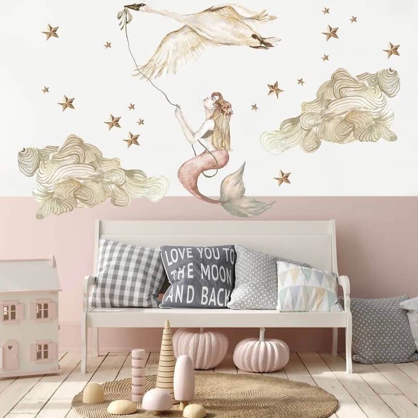 Prachtige zeemeermin sticker en een zwaan die erboven vliegt, in een poederachtige roze tint, een perfecte decoratie voor elke meisjeskamer.