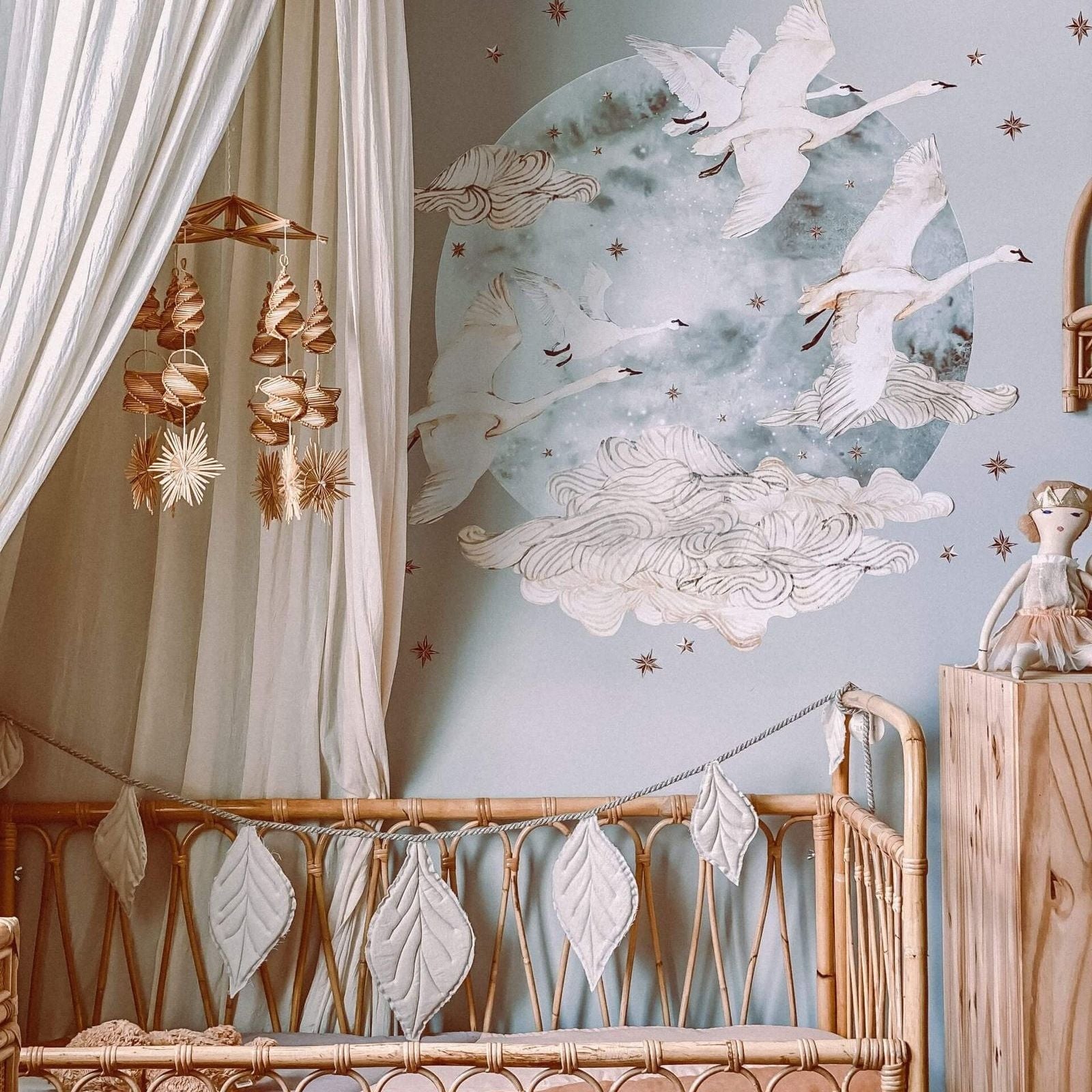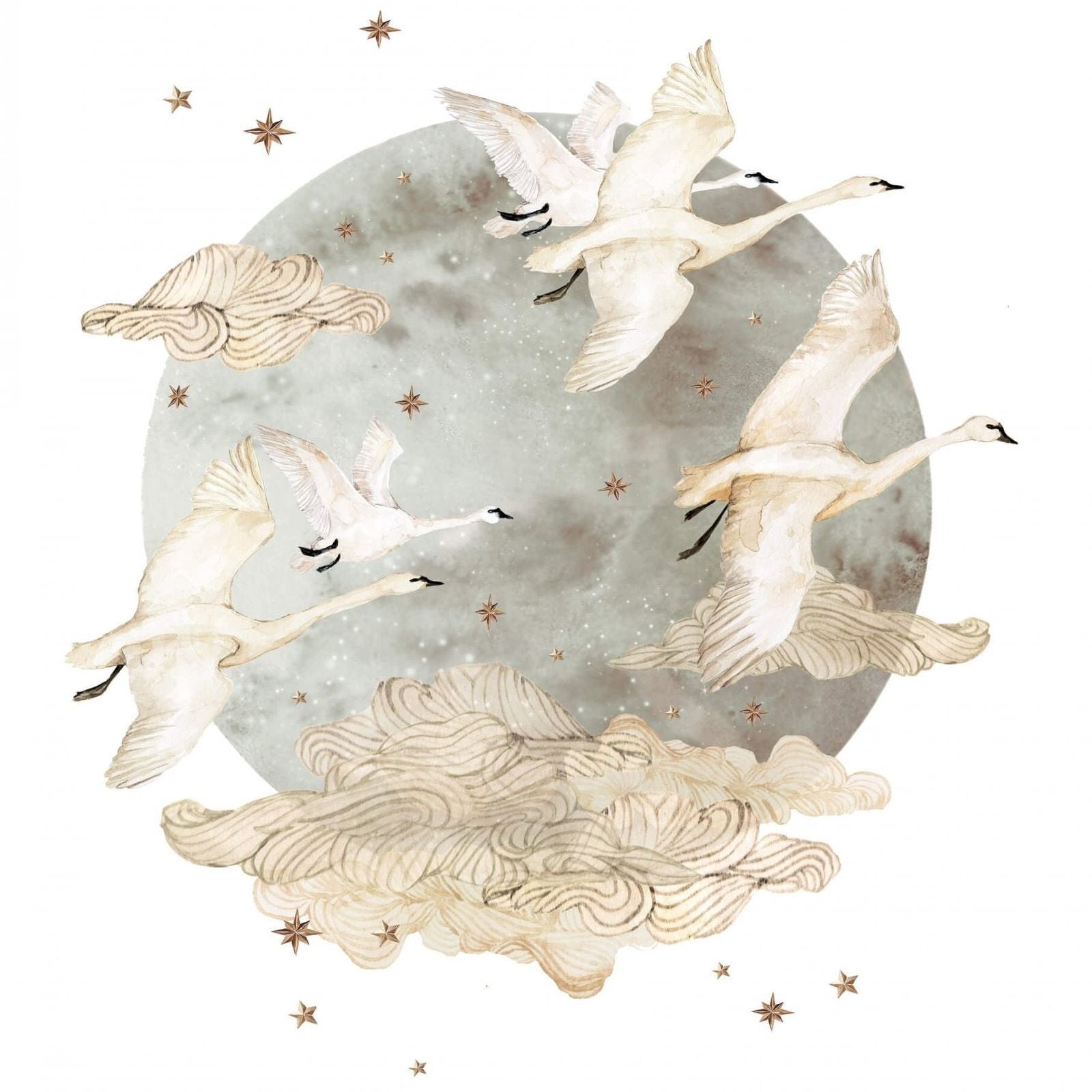 Prachtige muursticker 'Zwanen', tegen de achtergrond van de maan in blauw- en grijstinten, is zo universeel dat hij zowel in een meisjes- als jongenskamer zal passen.