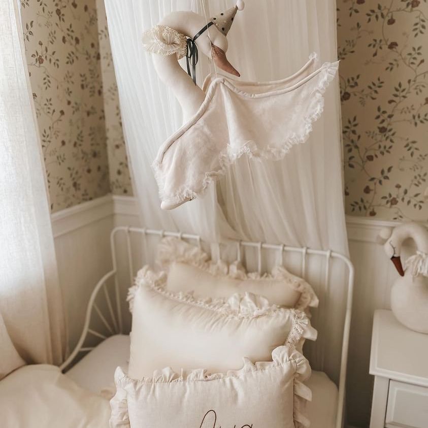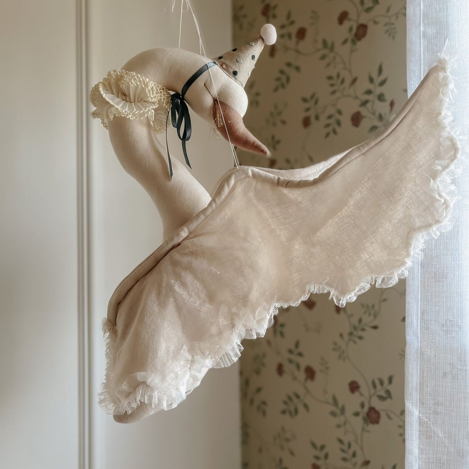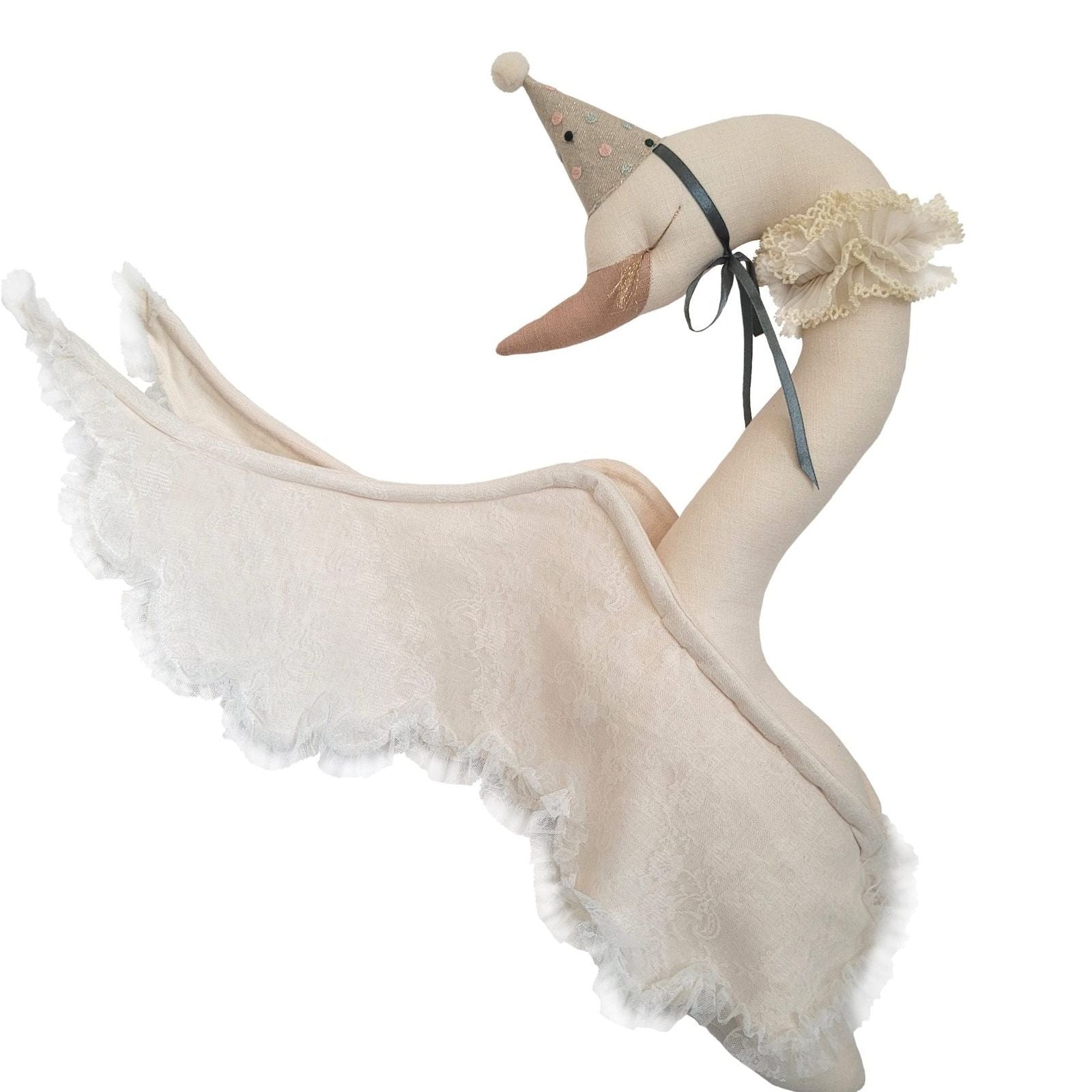 Prachtig handgemaakte zwaan in de kleur beige.Deze zwaan draagt een lief hoedje en is een buitengewoon mooie decoratie voor in de kinderkamer!