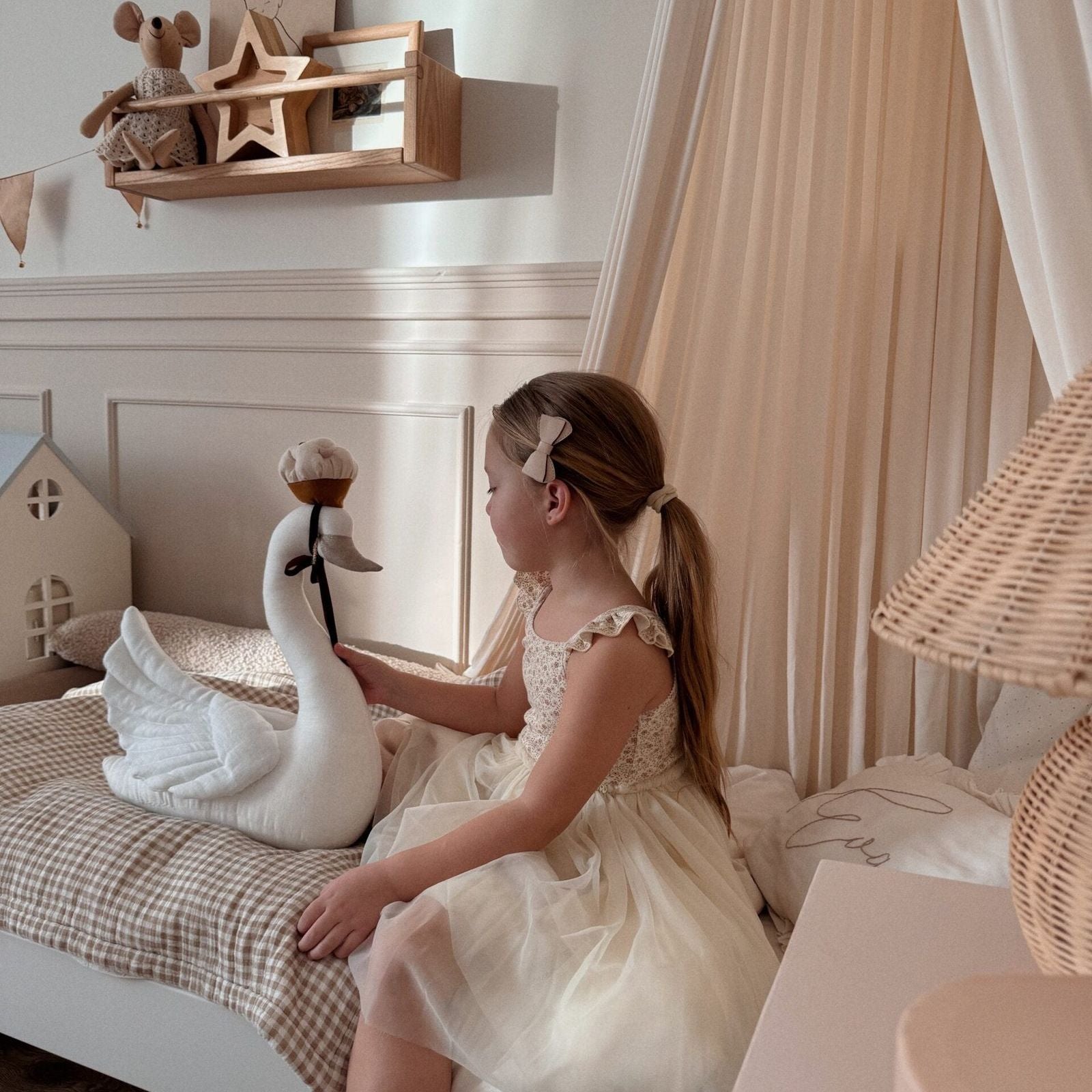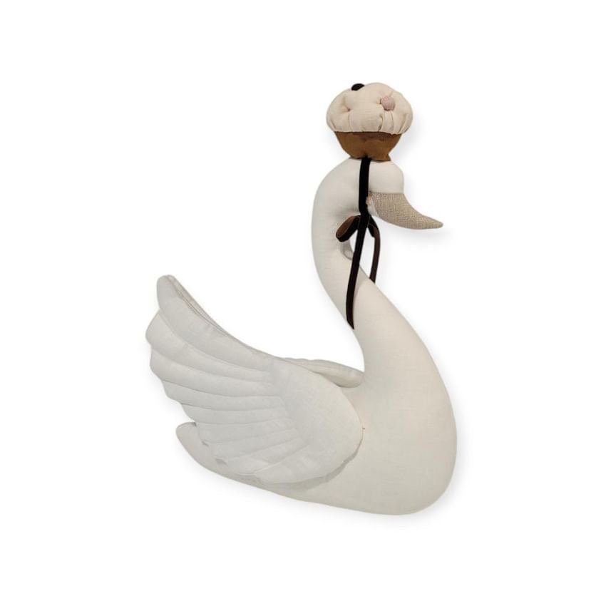 Prachtig handgemaakte zwaan.Deze zwaan draagt een cupcake op haar hoofdje! Sprookjesachtig mooi! Een buitengewoon mooie decoratie voor in de kinderkamer!