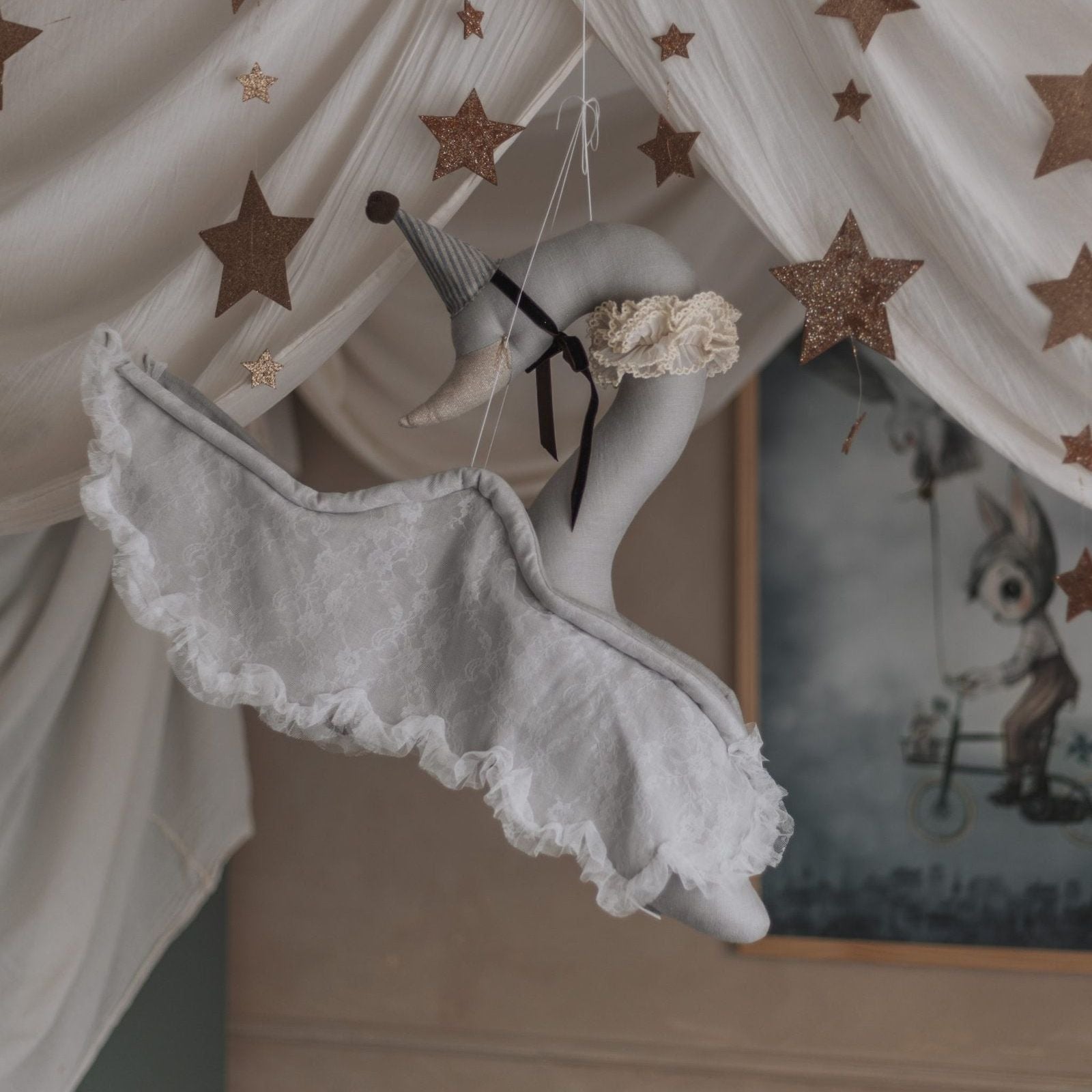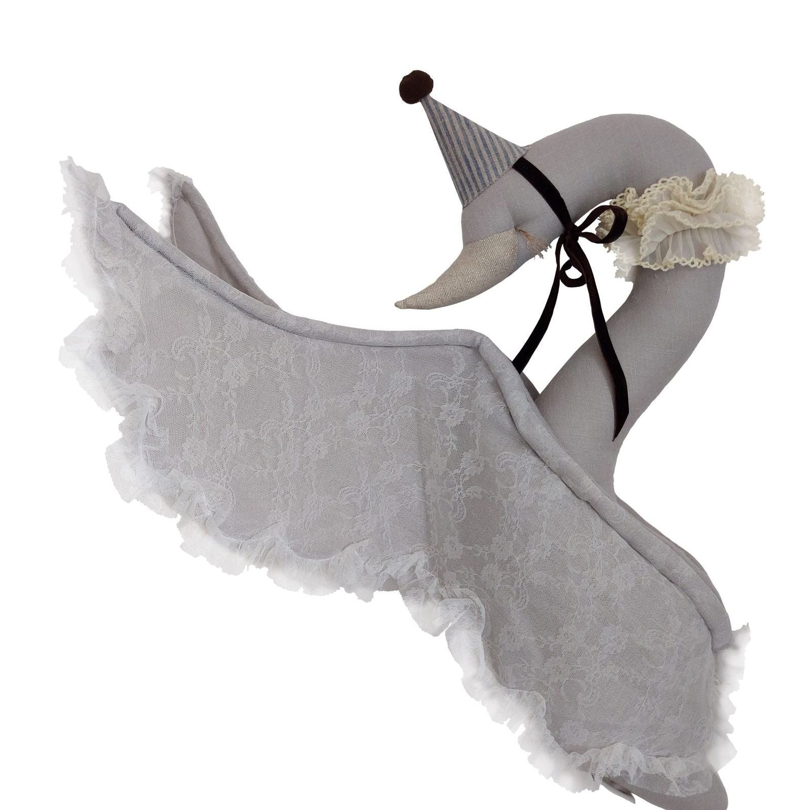 Prachtig handgemaakte zwaan in de kleur pigeon.Deze zwaan draagt een lief hoedje en is een buitengewoon mooie decoratie voor in de kinderkamer!